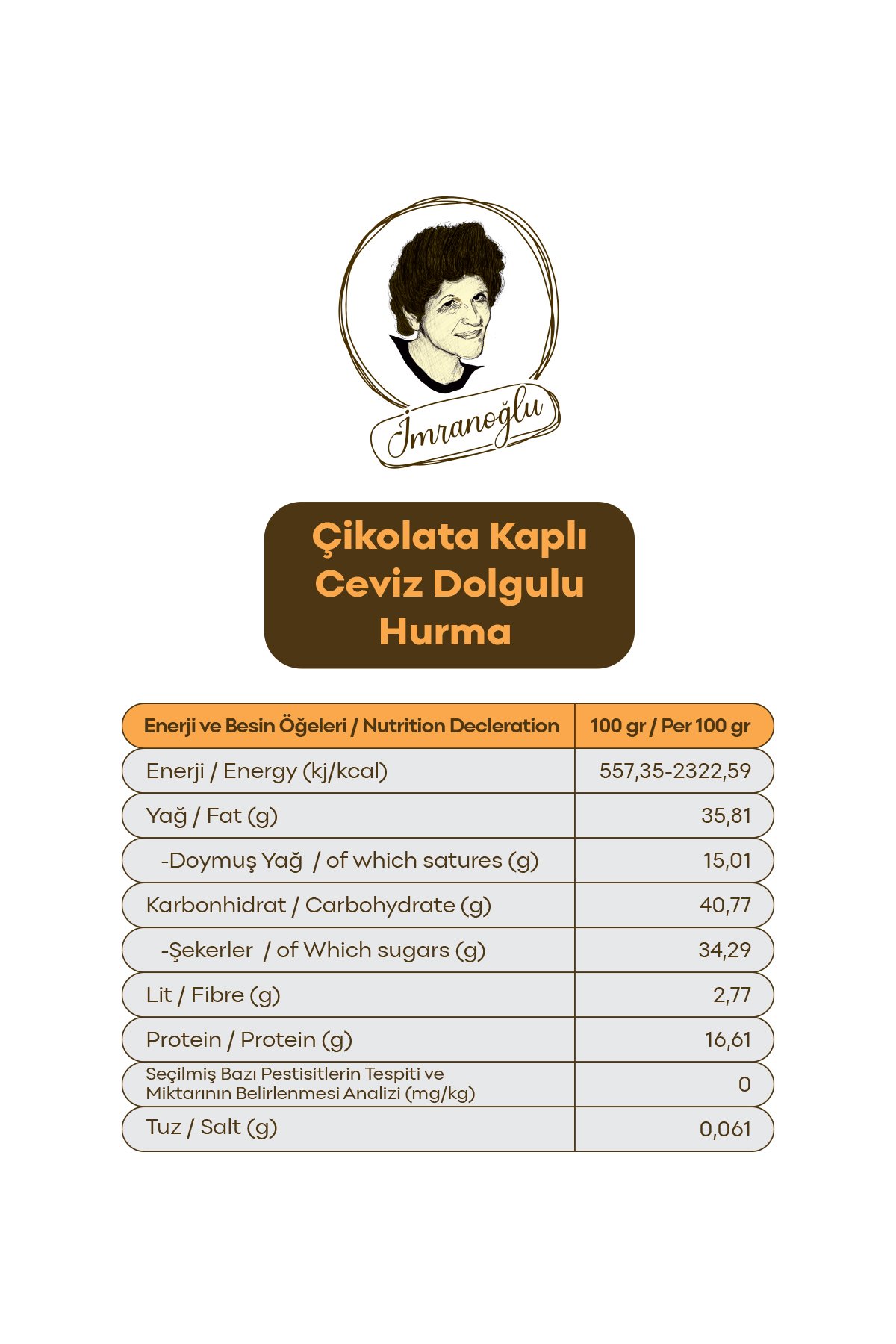 Cevizli hurma, Türk sofralarının klasikleşmiş lezzetlerinden. İmranoğlu, bu geleneksel lezzeti bir adım öteye taşıyarak sütlü çikolata kaplamasıyla daha şık, daha gurme bir forma dönüştürüyor.