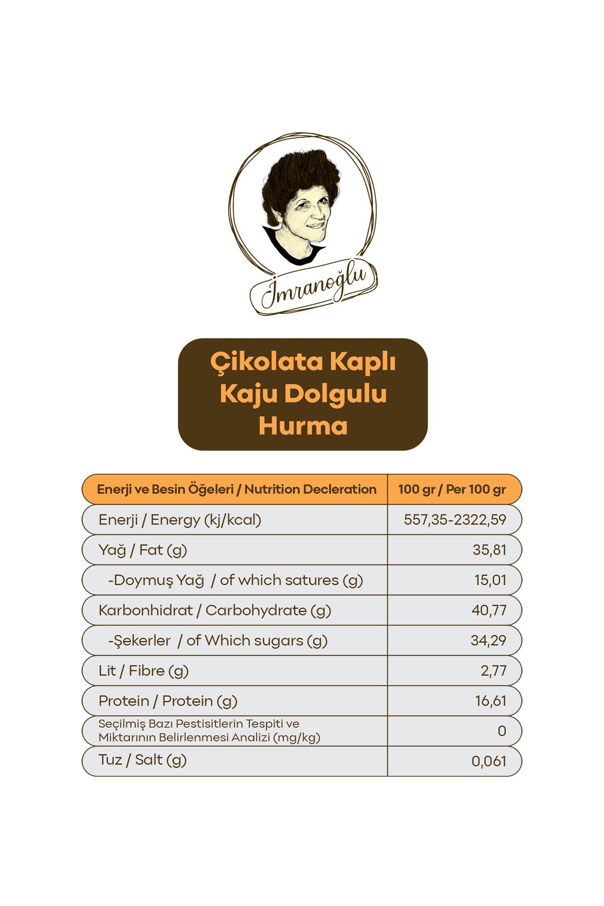 Bu üründe hurmanın doğal tatlılığı, kajunun kendine has yumuşak-çıtır dokusu ve sütlü çikolatanın kremamsı yapısı birleşiyor. Çikolata Kaplı Kaju Dolgulu Hurma, klasik hurma ikramlarının bir adım ötesine geçmek isteyenler için hazırlandı.